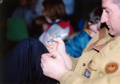 ユースセンターで 親子で来た人も。 真剣な表情で記録映画と
