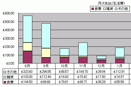 ブラッドフォードは、イギリスで最も物価の安い町です。これが大学の自慢で、パンフレットにも紹介されています。確かに、ロンドンなどと比べるとモノは安いです。ここでは、僕の普段の生活費を紹介します。もちろん、個人差はあると思うので、参考までにどうぞ。 家賃 食費 雑貨費 その他 僕の家計簿(2003年8月から2004年1月までの時点) ブラッドフォードに来た当初は、色々と出費が多かったです。その後は、食費と雑貨費はあまり変化がありません。ちなみに、12月は2週間の旅行に行っていたため、支出が少なくなっています(旅費は加算していない)。大体、10月、11月、1月が平均的な支出だと思います。 |