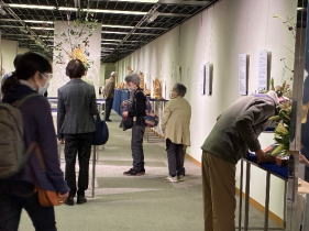 | 開催日前日の11/4(木)の作品搬入日は写真撮影可とされましたが、今年はコロナウィルス感染予防のため、「搬入はグループ別で作業後はすぐに退出」との対策がとられました。大急ぎで展示しながらの撮影は残念でしたが、2年ぶりに出品参加できたことや仲間との再会を喜び合いました。 | ||