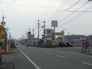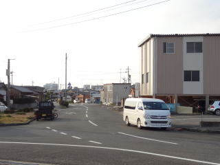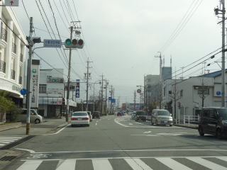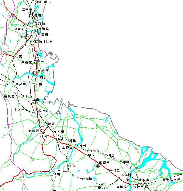 | 松阪の市街地も、廃線跡は立派な道路として続く。古い写真をみると新松阪駅の周辺はのどかな雰囲気のようだが、今ではビルが立ち並んでいて面影が全くない。新松阪から先は近鉄に合併される前に廃止となった区間だが、ここも櫛田川と宮川の前後を除くと立派な道路になっていて鉄道の雰囲気が感じられる所は無かった。ちなみに、櫛田川と宮川の間の廃線跡は、参宮道路という日本初の有料道路になり、その後無料開放されたものである。 | |