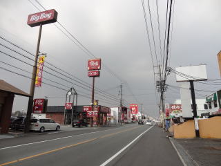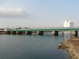 | 岩田川橋梁は、伊勢電の橋脚がそのまま道路橋に転用されている。その先も廃線跡の道路は続き、郊外型の店舗が並んでいて交通量がかなり多かった。 | |