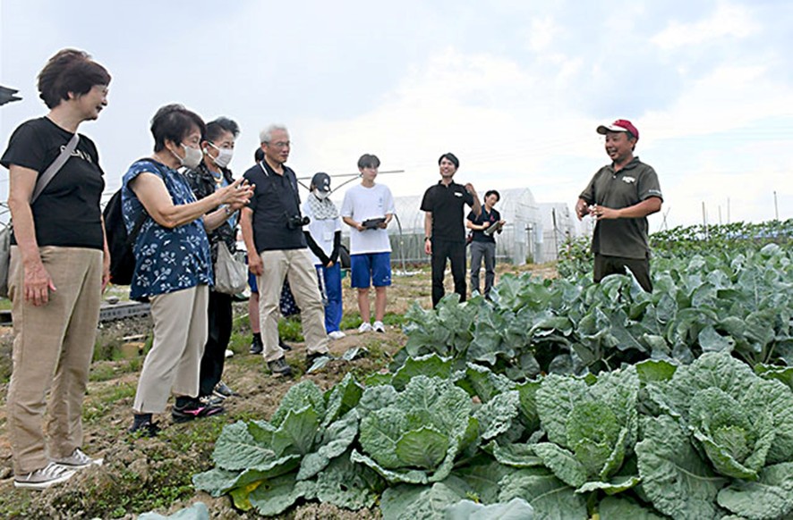 河北町の谷地高(堀米和志校長)の生徒が18日、首都圏に住む町出身者でつくる「いきいき関東河北会」を対象としたツアーを開き、町内の園地で特産品などを紹介した。 同校と同町の地域商社かほくらし社、町の3者による産学官連携プロジェクトの一環で、初開催。同会の70~80代の男女4人と同校3年生4人が参加した。町特産の「かほくイタリア野菜」の畑では「サボイキャベツ」や黄色いカリフラワーといった珍しい作物を見学した。生徒は事前に農家に聞き取りした内容を基に「町の気候がイタリアに似ていることから、冬の地域産業にしようと研究会が発足した」などと説明した。 神社や展望台も巡り、イタリアントマトのオリーブオイル漬け作りを体験した。同校出身の神奈川県座間市、無職増島悦子さん(80)は「坂道で手をつないでくれたり、楽しくおしゃべりしたり、優しい後輩たちと交流できて楽しかった」。奥山花さん(18)は「町を紹介する側だけど、教わることが多くて勉強になった」と話していた。「山形新聞2023年9月19日 」「写真提供/山形新聞社」