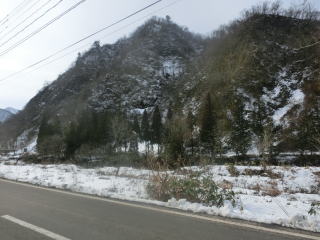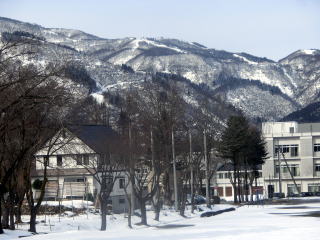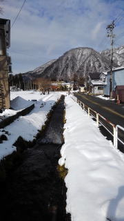 珍しく小雪の河原に白がのんびり一休み、周りの山も薄化粧。