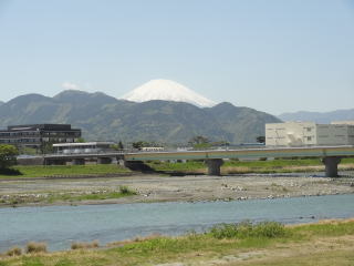 | 小田急線酒匂川橋梁付近からの眺め。足柄の山並みの向こうに、真っ白な富士山が見えている。 |