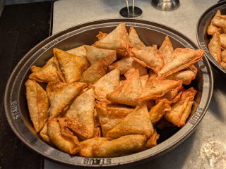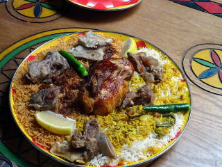 | サウジアラビアの料理は、お米を使うものが多い。カブサは香辛料をきかせた炊き込みご飯で、ご飯が何種類も入っていて、上にはチキンやラムがのっている。サンブーサは肉やチーズを包んで揚げたもので、いろいろな種類があった。 |