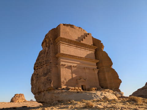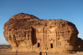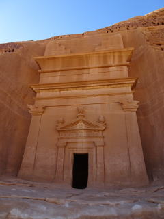 | 次に訪れたのが、マダイン・サーレハで最も有名な、カスル・アル・ファリード。ここは、1つの岩山が1つの墓になっている。正面に陽があたるのは夕方だけなので、遅めの出発でラッキーだった。 |