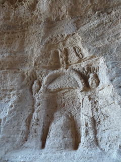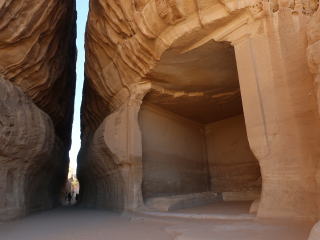 | マダイン・サーレハは、自由に見てまわることはできず、現地の混乗ガイドツアーに参加することになる。参加したガイドツアーは15時出発で、約2時間かけて4ヶ所を巡った。 最初は、ジャバル・イスリブ。ここは岩が大きく掘り込まれており、重要な会議や儀式が行われたと考えられてる。その前は岩の間の狭い通路(シク)になっていて、ペトラのシクが思い出された。シクの途中には、ナバテア人の神ドゥシャラ(鷲)が彫られた祭壇もあった。 |