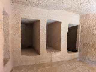 | 2ヶ所目ジャバル・アルバナート。少女の山という意味で、岩山に多くの女性の墓が刻まれている。1ヶ所だけ中に入れる墓があったが、内部は狭く、遺体や副葬品を置いたと思われる横穴がいくつかあるだけだった。 |