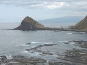 ここからは、神子岩と遠く大佐度の西端が見えます。波が岩に当たっては砕けていきます。目の下が崖になっています。