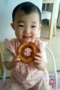 両手でドーナツを持っています。 バックを持って買い物に行くようです。 2011.1.17